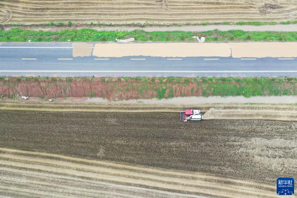 5月30日,在河南省驻马店市正阳县铜钟镇,收割机在抢收小麦(无人机照片)。