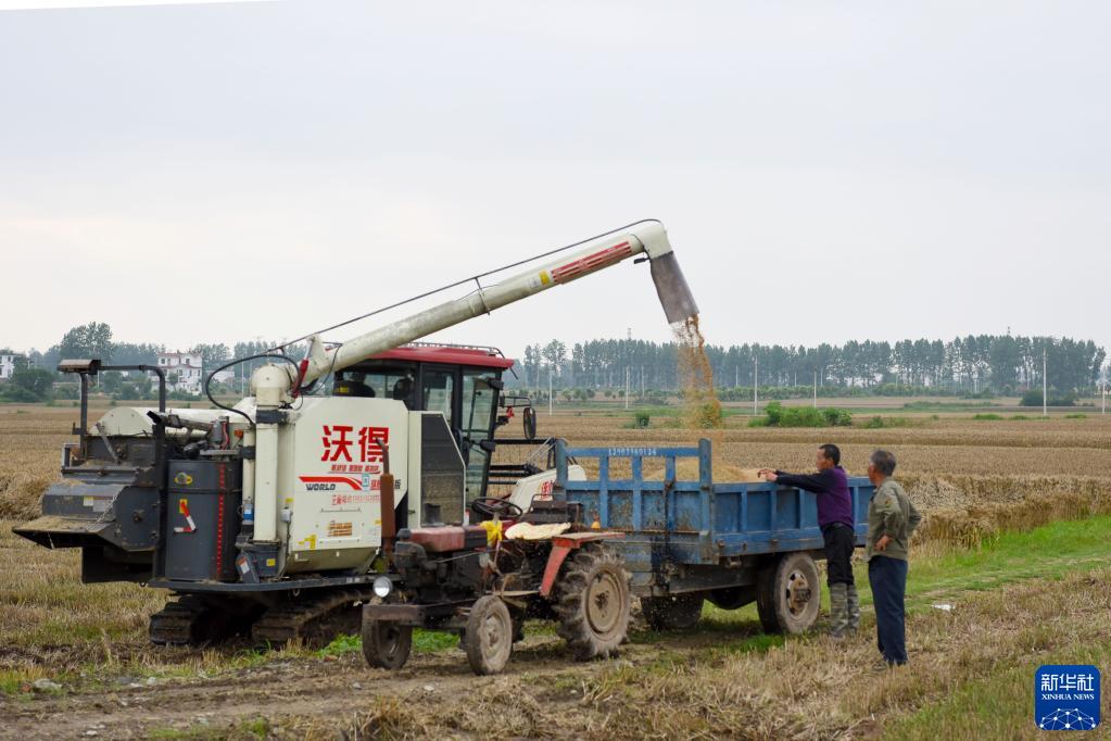 5月30日,在河南省驻马店市正阳县铜钟镇,收割机将收获的小麦装车。