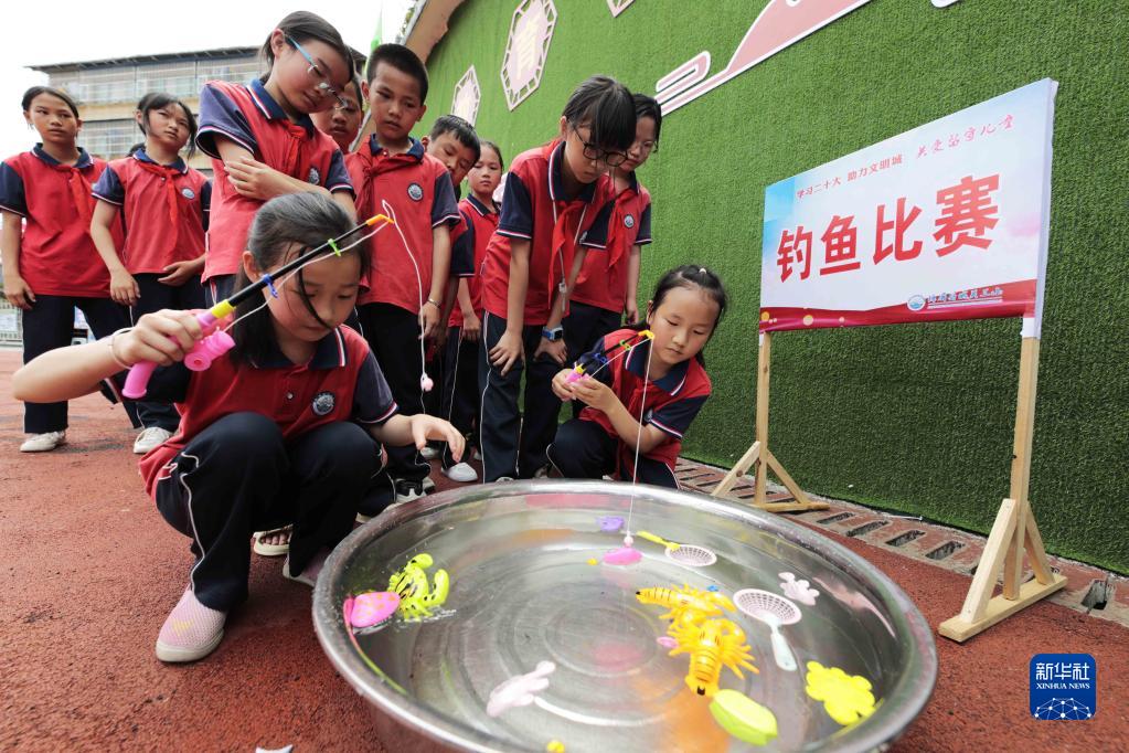 5月30日,贵州省锦屏县城关第三小学学生在参加钓鱼比赛。