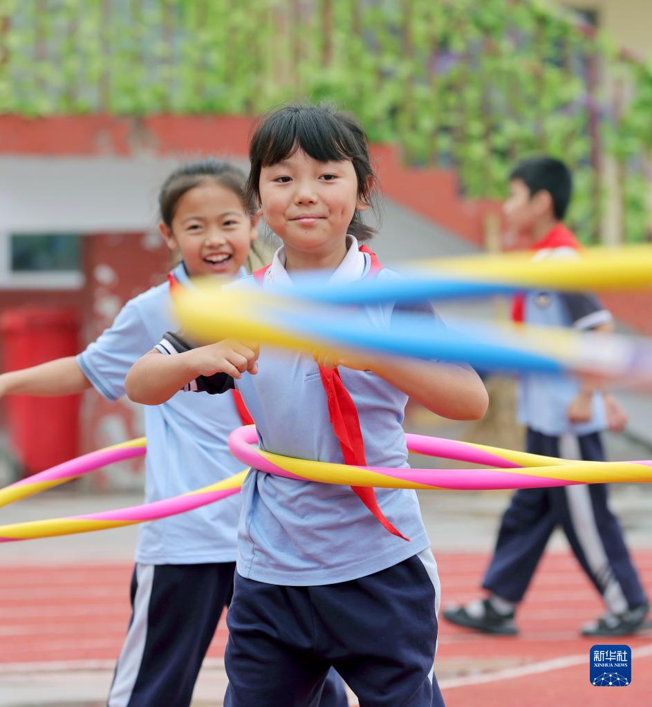 5月30日,河北省邢台市广宗县第六小学学生在参加呼啦圈游戏。