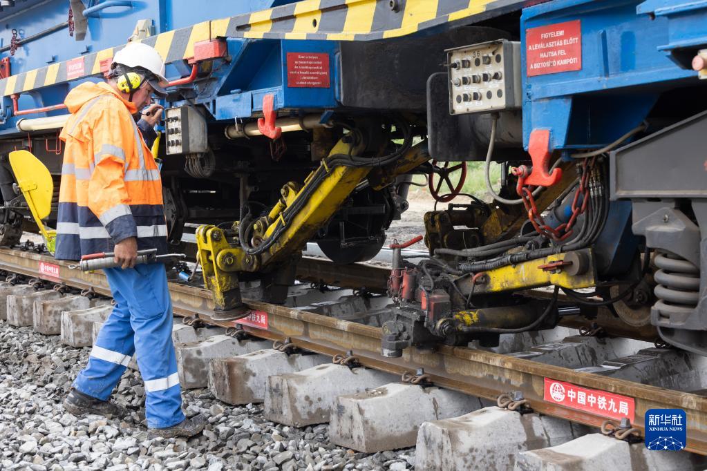 5月30日,在匈塞铁路匈牙利段孔圣米克洛什-陶什站施工现场,工作人员调整铺轨机作业状态。