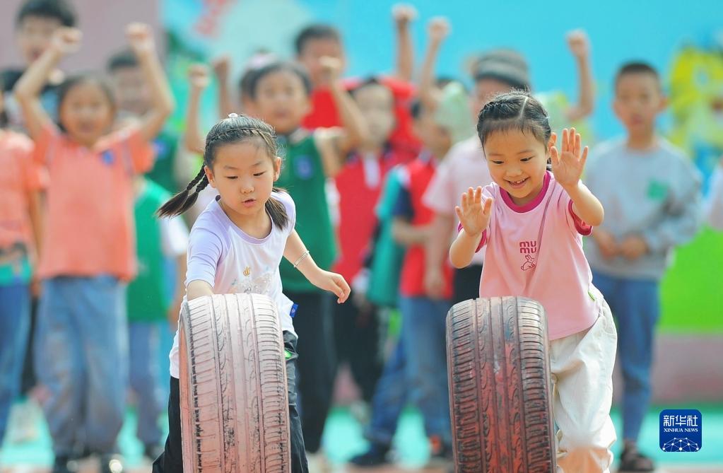 5月31日,在山东省滕州市西岗镇一所幼儿园,小朋友在进行滚轮胎比赛。