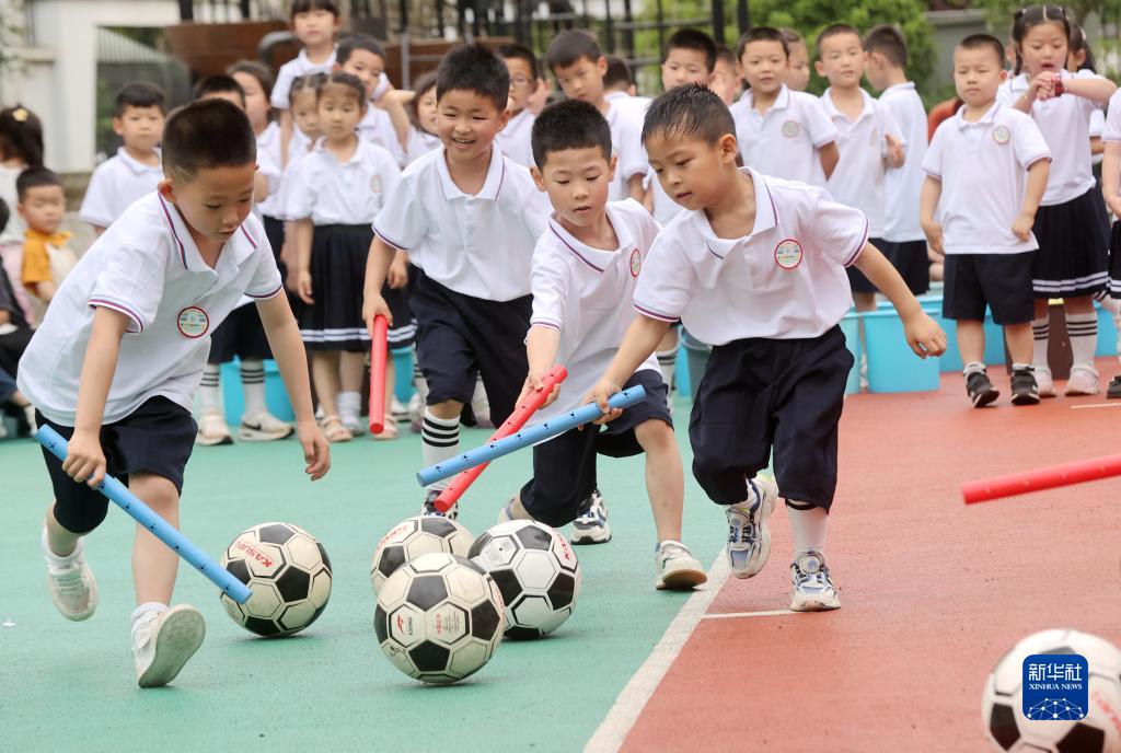 5月31日,浙江省湖州市德清县三桥幼儿园的孩子们在进行“赶小猪”游戏。