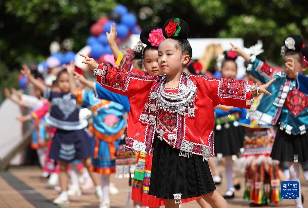 5月31日,贵州省黔东南苗族侗族自治州丹寨县示范幼儿园的小朋友在表演苗族锦鸡舞。