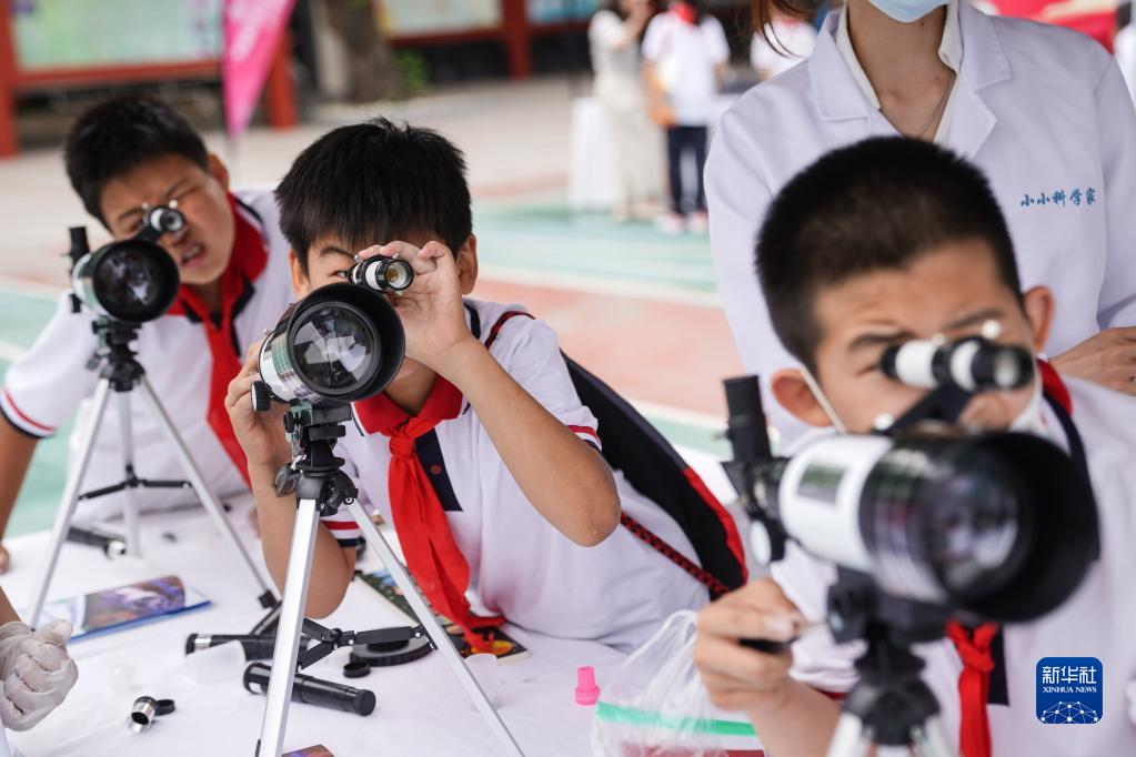 5月31日,在北京市东城区分司厅小学举行的2023年东城区青少年科技馆“玩转科学 童心筑梦”科技嘉年华活动上,同学们在体验、展示自己制作的天文望远镜。
