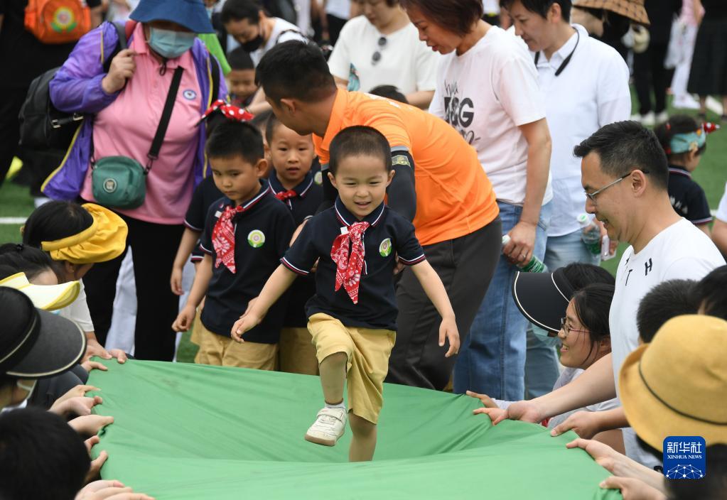 5月31日,在北京大学医学部幼儿园2023年庆“六一”亲子运动会现场,小朋友和家长参与亲子游戏。