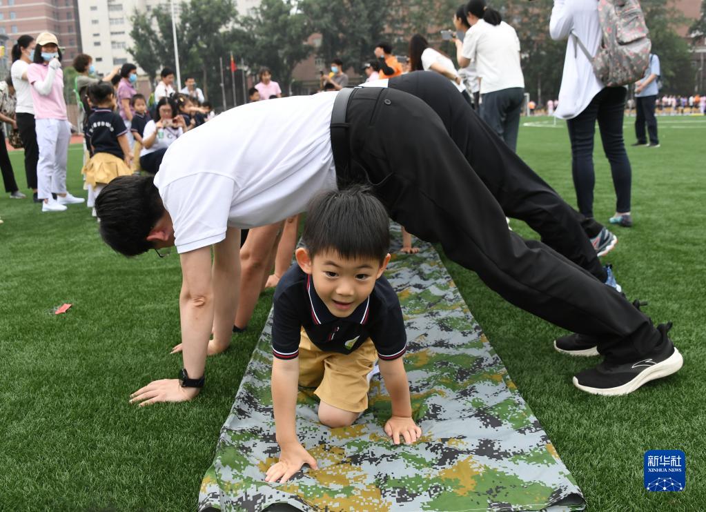 5月31日,在北京大学医学部幼儿园2023年庆“六一”亲子运动会现场,小朋友和家长参与亲子游戏。