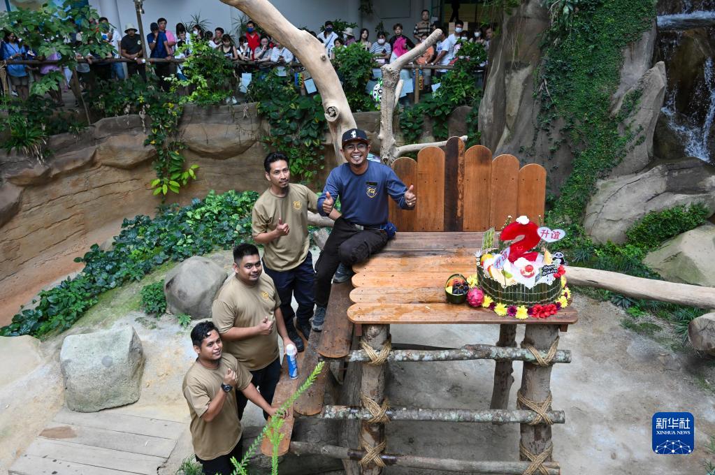 5月31日,在马来西亚吉隆坡附近的马来西亚国家动物园,大熊猫饲养员阿克迈勒(右)和他的团队与“升谊”的生日蛋糕合影。