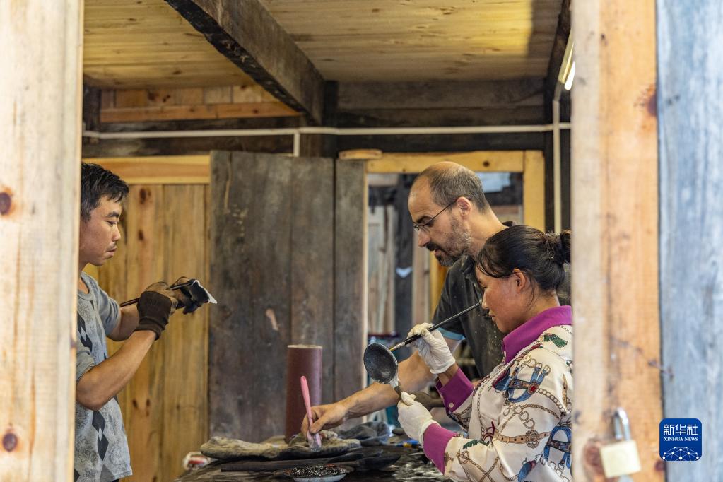 5月29日,在重庆市城口县北屏乡松柏村,文森·漆在工作室与当地村民给作品上漆。