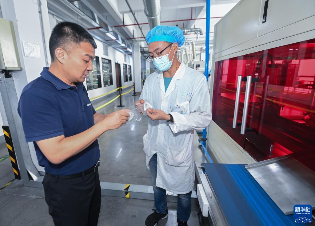 5月31日,浙江正雅齿科股份有限公司董事长姚峻峰(左)在位于嘉兴南湖高新区的公司车间内查看个性化定制式隐形正畸矫治器的生产。姚峻峰是毕业于英国赫尔大学的工商管理硕士,回国后创办了正雅齿科公司。