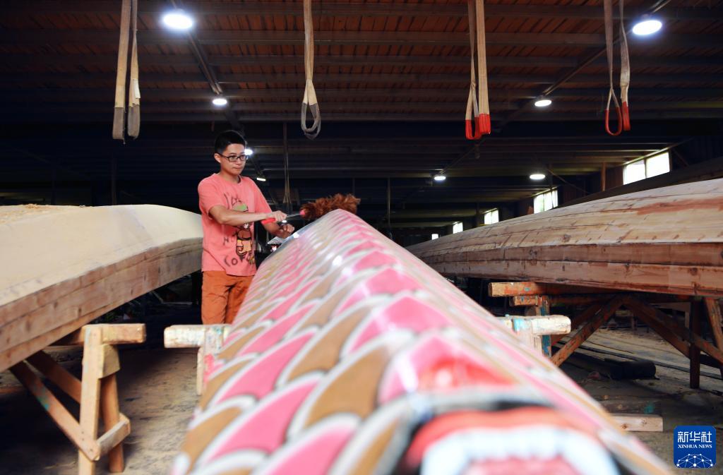 5月31日,福州市闽侯县南通镇方庄村方忠雄龙舟厂的方剑伟擦拭新龙舟进行。