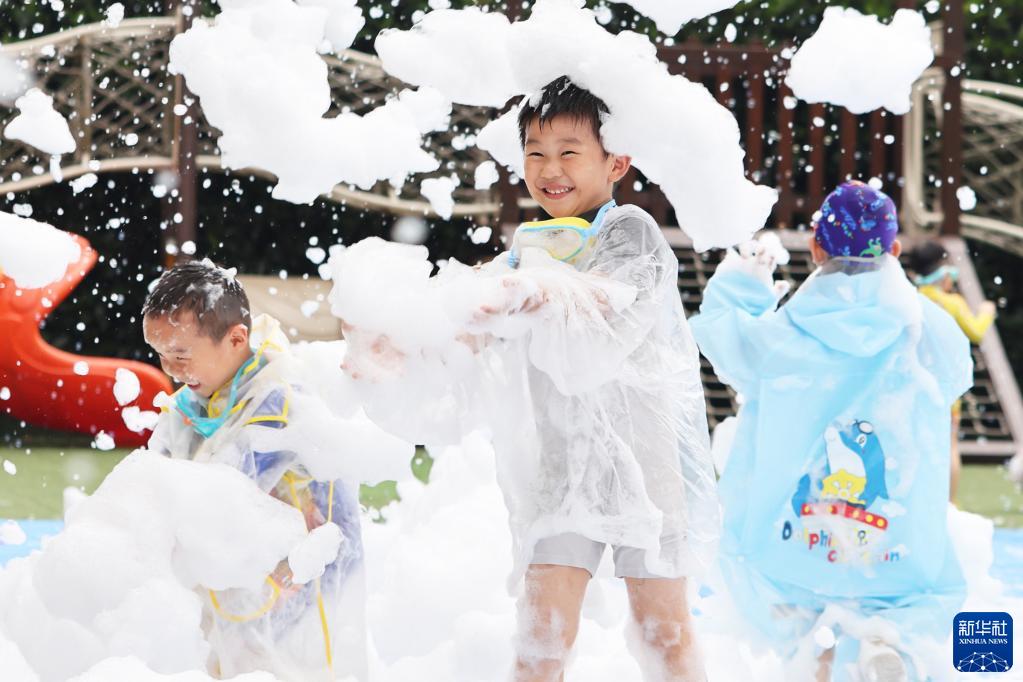 5月31日,在南京市金陵华兴实验幼儿园,小朋友们在“泡泡派对”上玩耍。