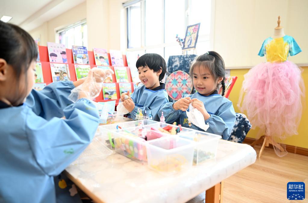 5月31日,在天津市和平区第五幼儿园,小朋友学习制作扎染。