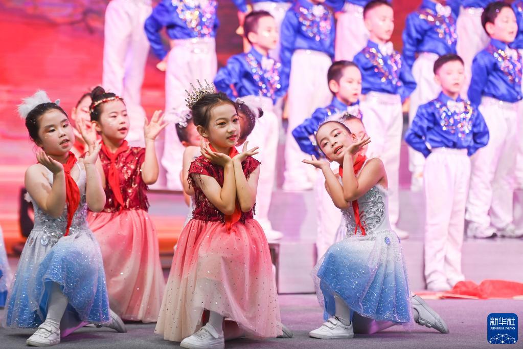 5月31日,杭州市萧山区湘师实验小学教育集团(南城校区)的学生表演合唱节目《我和我的祖国》。