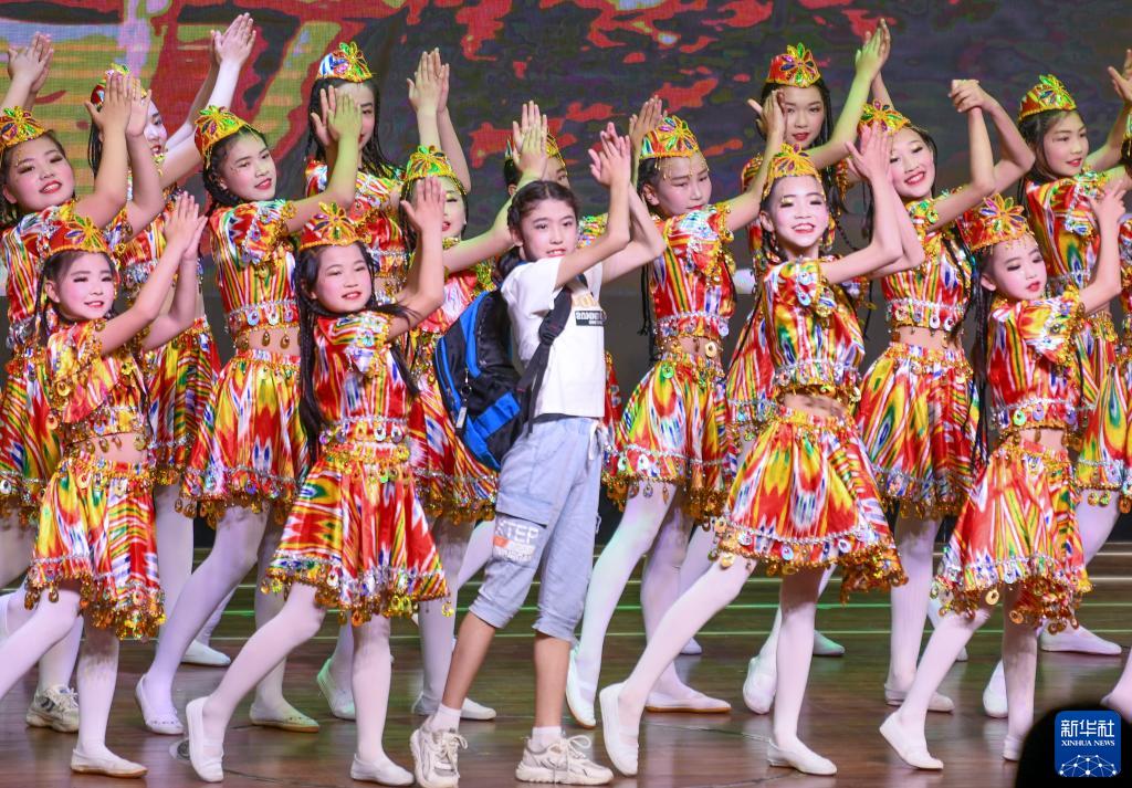 5月31日,新疆乌鲁木齐县中梁小学的学生在文艺演出中表演舞蹈。