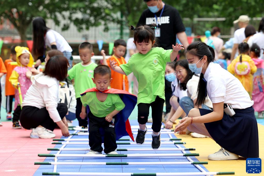 5月31日,在石家庄市长安区第一幼儿园,孩子们进行“快乐竹竿舞”游戏。