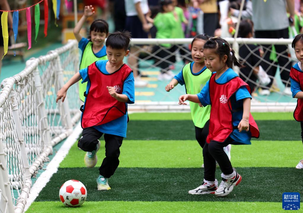 5月31日,在石家庄市长安区第一幼儿园,孩子们进行快乐足球游戏。