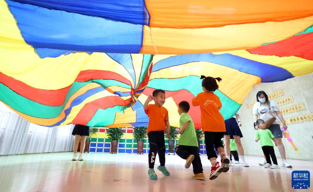5月31日,在石家庄市长安区第一幼儿园,孩子们进行“遇见彩虹”亲子游戏。