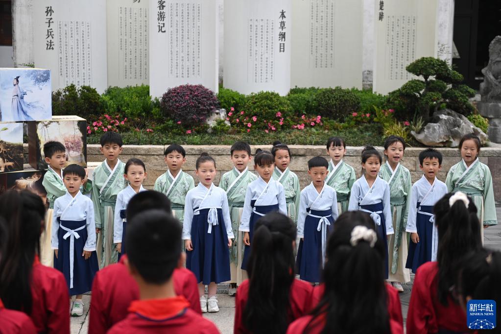 5月31日,在浙江省湖州市吴兴区八里店镇潞村“典籍里的中国”陈列馆门口,参加“诵读国学经典 传承华夏气韵”主题活动的小学生集体诵读国学篇目。