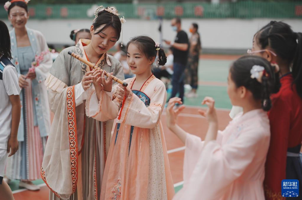 5月31日,在石家庄市新华区东风小学师生着传统服饰参加迎“六一”的活动。