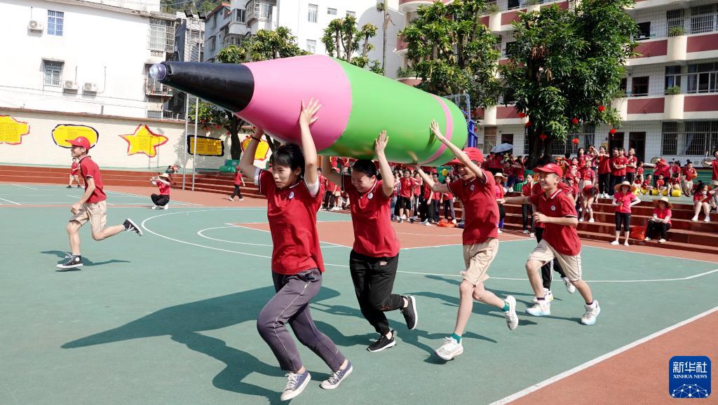 5月31日,广西河池市金城江区第四小学学生参加“神笔马良”趣味游戏。