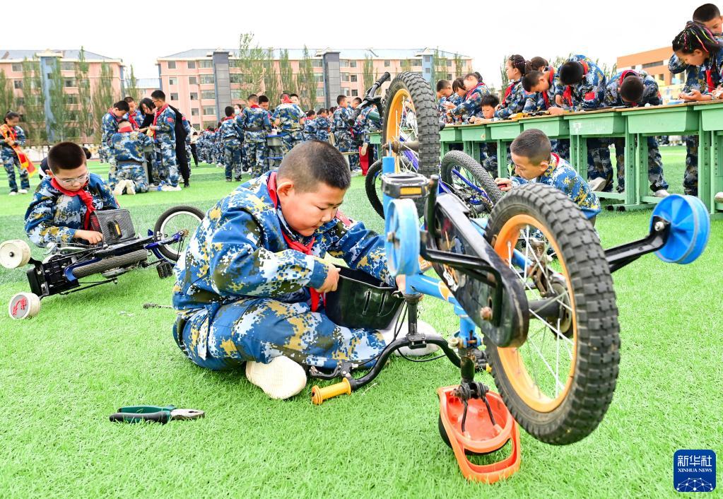 5月31日,内蒙古鄂尔多斯市鄂托克前旗第四小学学生在“我劳动 我快乐”主题活动中修理自行车。