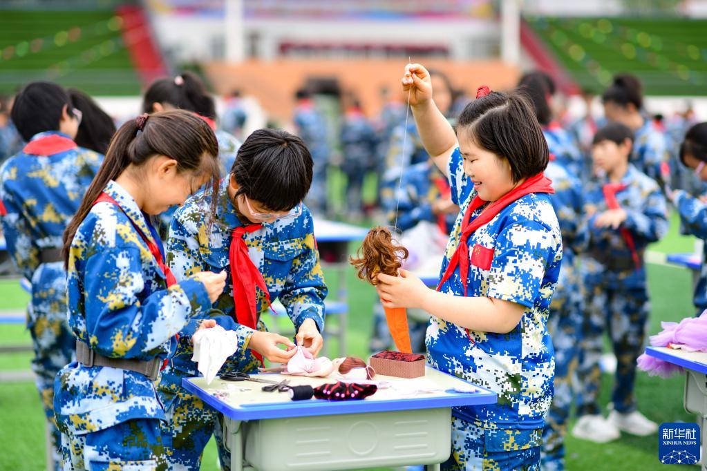 5月31日,内蒙古鄂尔多斯市鄂托克前旗第四小学学生在“我劳动 我快乐”主题活动中制作玩具。