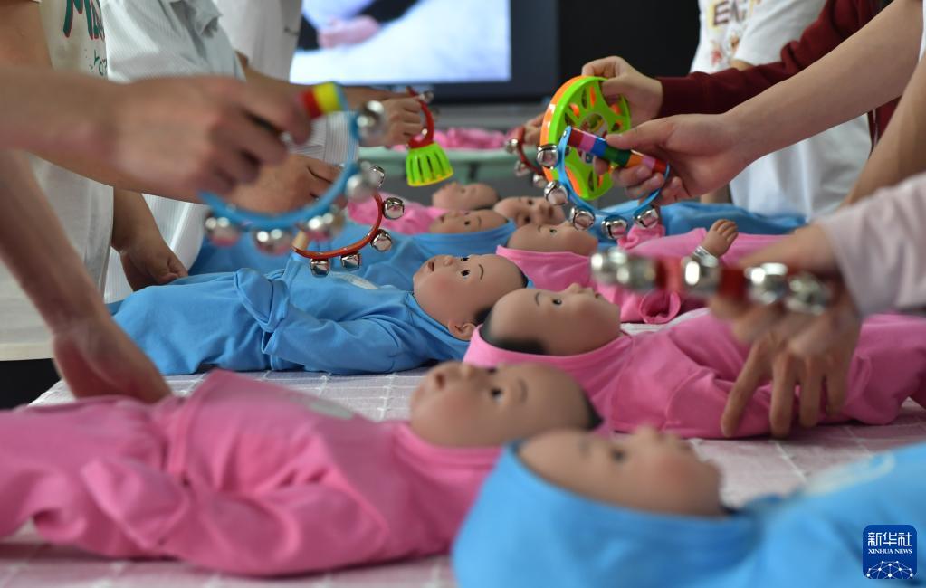 5月31日,在沈阳工学院婴儿照顾实训室,学前教育学院的同学进行婴儿照顾培训。