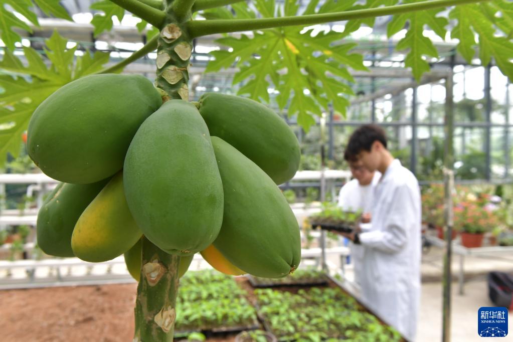 5月31日,在沈阳工学院现代农业科技馆,生命工程学院同学观察植物种苗生长情况。