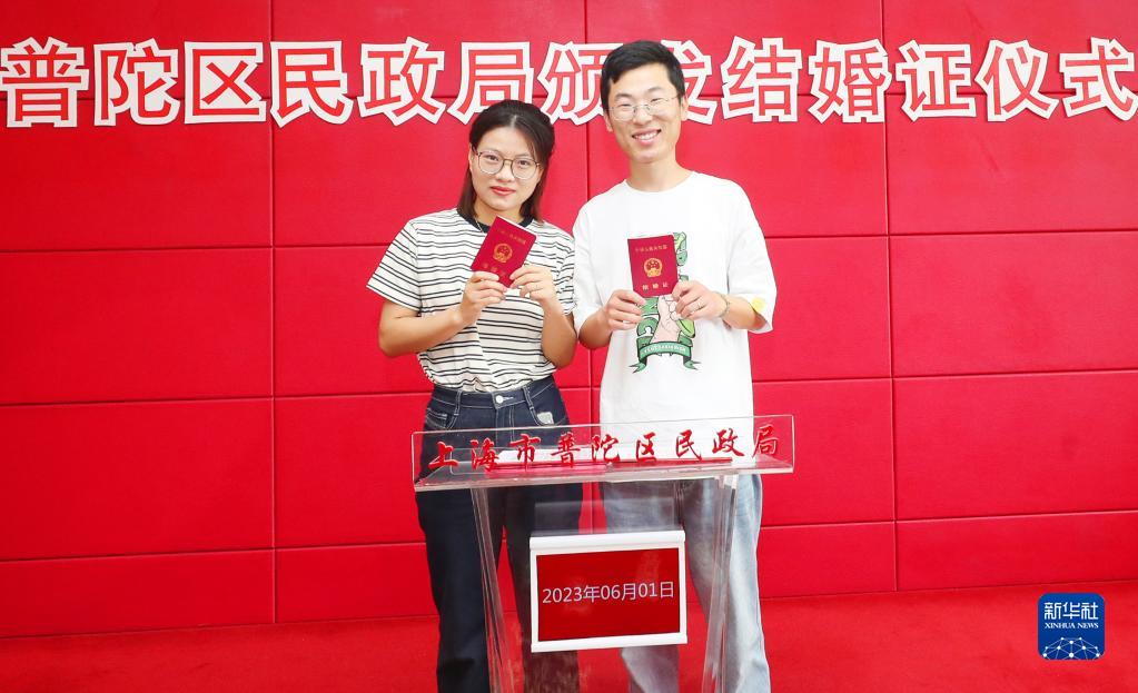 6月1日,来自江苏的刘先生和袁女士在上海市普陀区婚姻收养登记中心展示他们刚领取的结婚证。