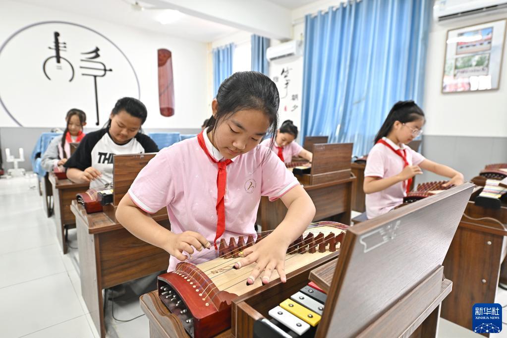 5月31日,中关村第三小学雄安校区智能筝社团的学生们在练习弹奏古筝。