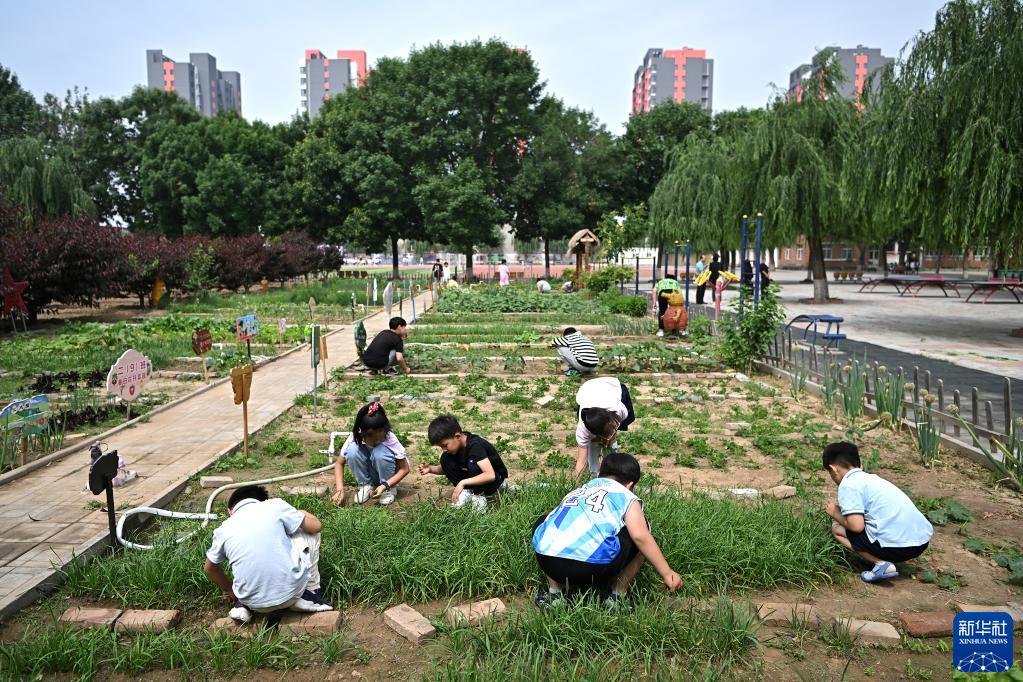 5月31日,中关村第三小学雄安校区的学生在学校设立的“雄安农场”里手工除草。“雄安农场”里每个班级都有自己的一块土地,学校通过农场劳动课,让同学们从科学走向生活,从知识走向能力。