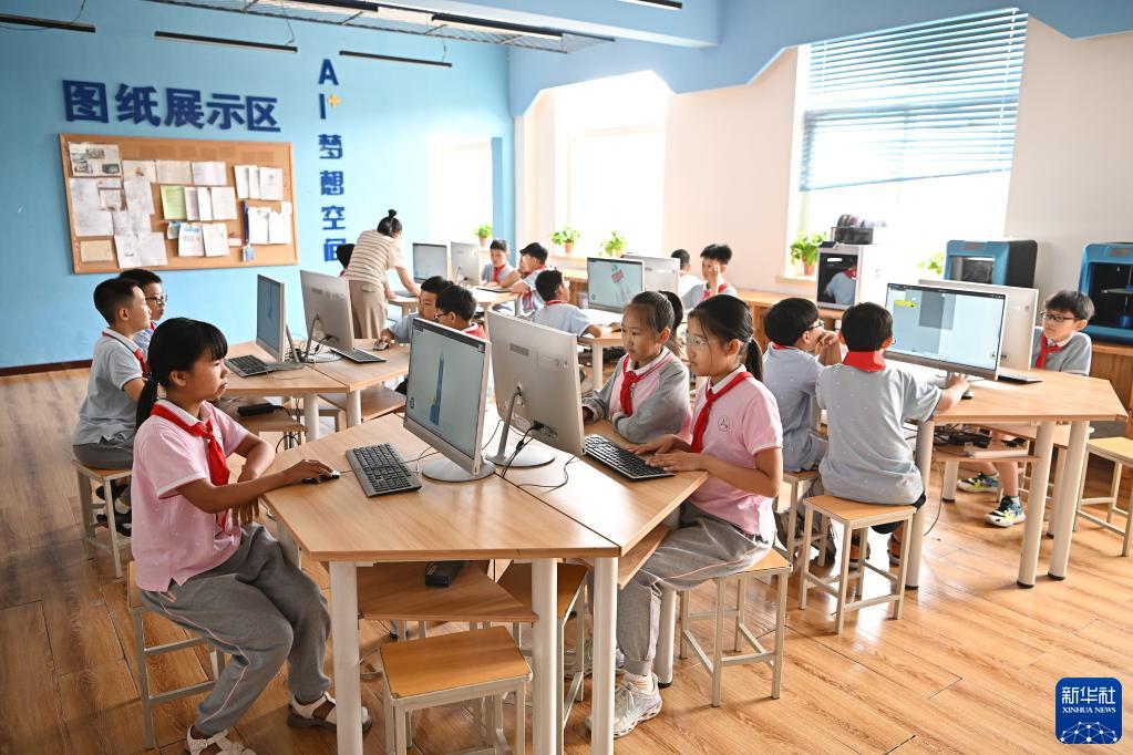 5月31日,中关村第三小学雄安校区3D打印社团的同学们在软件上设计火箭模型。
