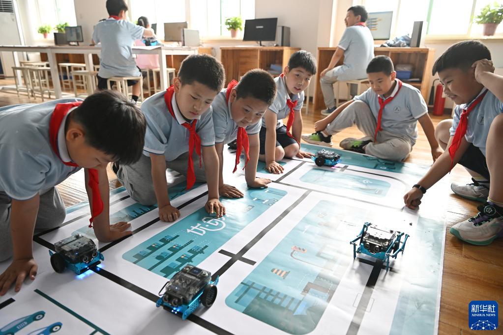 5月31日,中关村第三小学雄安校区编程社团的学生检验机器人的编程效果。