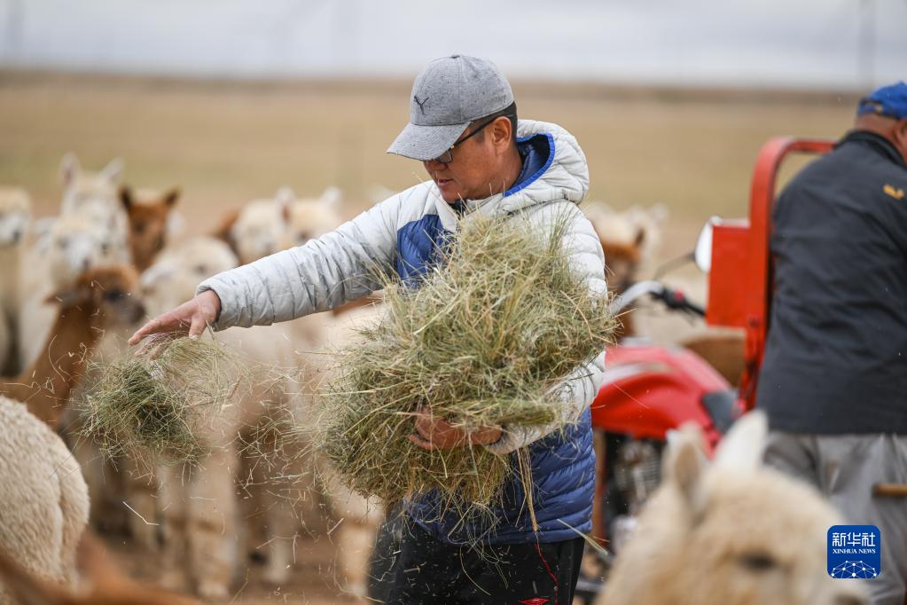 6月1日,巴彦杭盖嘎查羊驼养殖基地的工作人员给羊驼喂食。