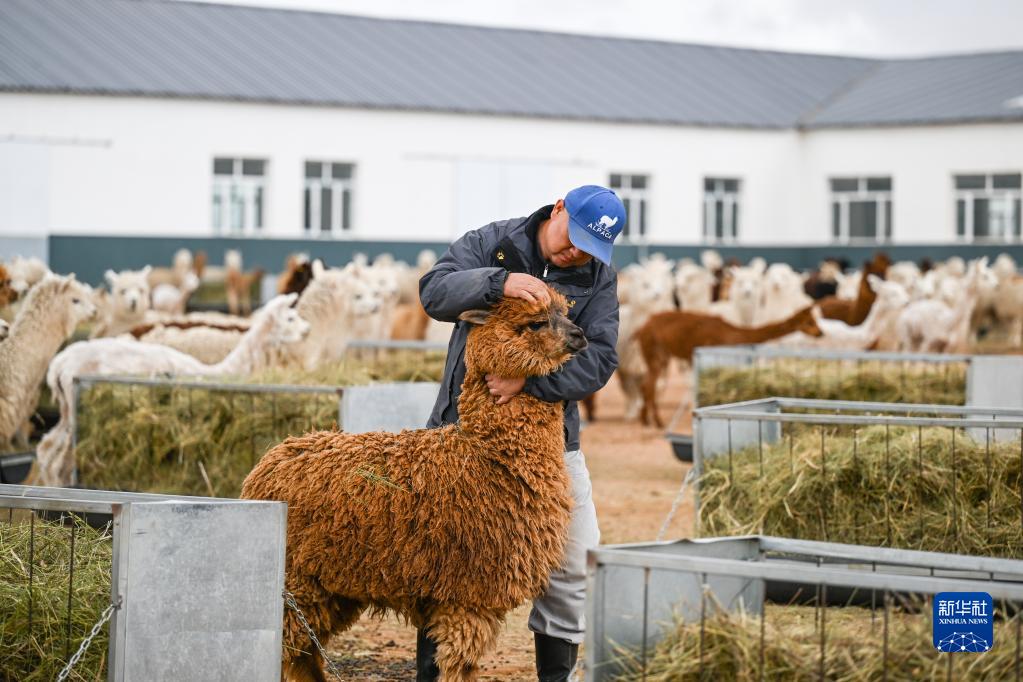 6月1日,巴彦杭盖嘎查羊驼养殖基地的工作人员在观察羊驼的饲养情况。