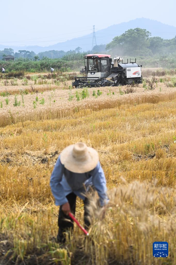 6月1日,在道场乡施家桥村的麦田里,收割机在抓紧抢收小麦。