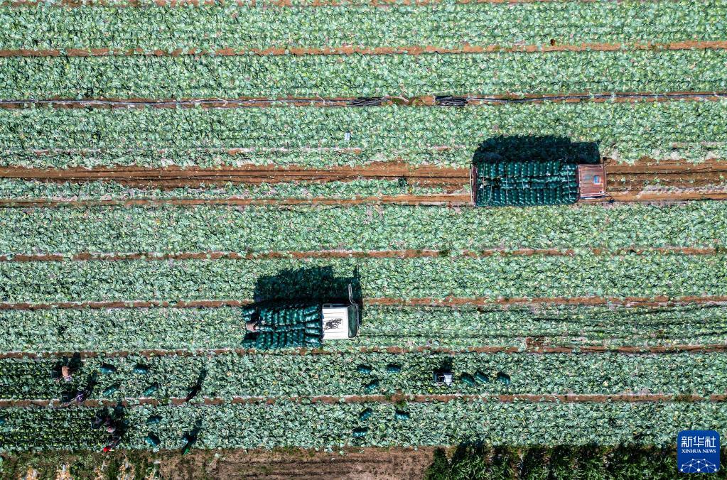 6月1日,农民在河北省玉田县虹桥镇一处供京蔬菜基地内将收获的甘蓝装车(无人机照片)。