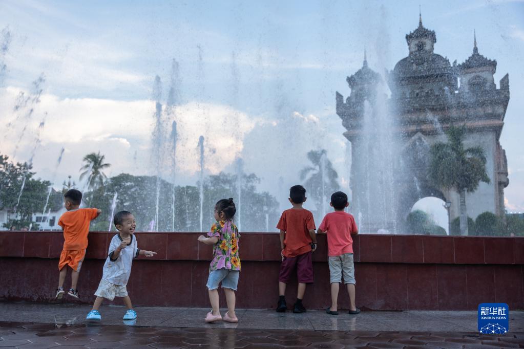 6月1日,孩子们在老挝首都万象的凯旋门边观赏喷泉,庆祝“六一”国际儿童节。