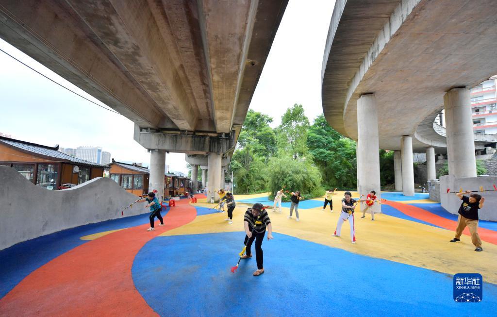 6月1日,居民在宣恩县一处立交桥下建设的健身场地休闲。