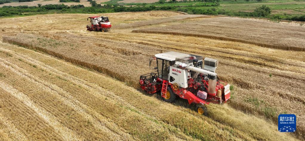 6月2日,在合肥市蜀山区小庙镇段冲村,农机手操作机械设备收割小麦(无人机照片)。
