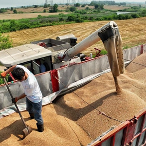“三夏”时节,在合肥市蜀山区小庙镇,农民操作大型收割机收割小麦,田间地头一派忙碌景象。