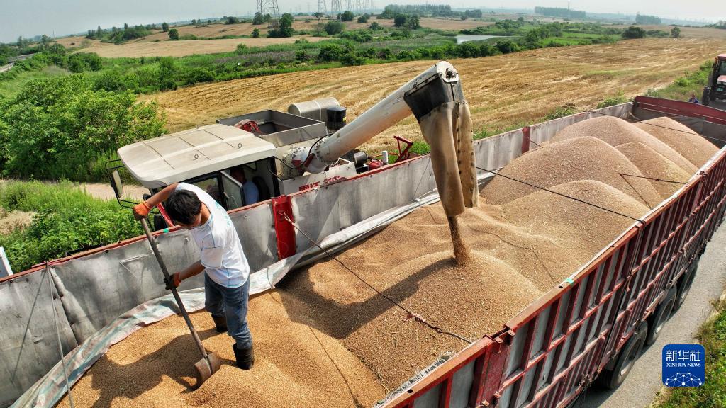 6月2日,在合肥市蜀山区小庙镇段冲村,收割机将小麦装车(无人机照片)。