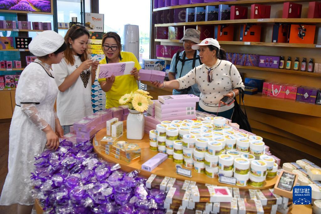 在新疆伊犁哈萨克自治州伊宁县天山花海国家农业产业园,游客在服务中心选购特色产品(5月18日摄)。