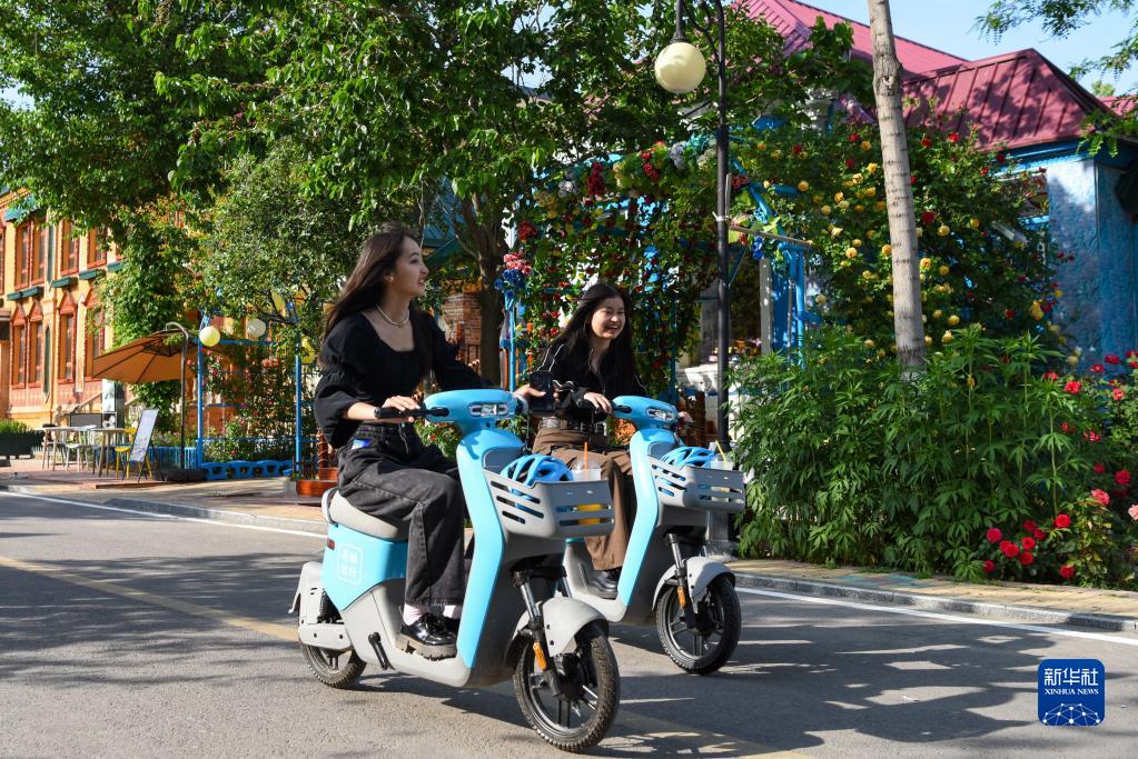 在新疆伊犁哈萨克自治州伊宁市六星街,游客骑着电动车游览(5月19日摄)。
