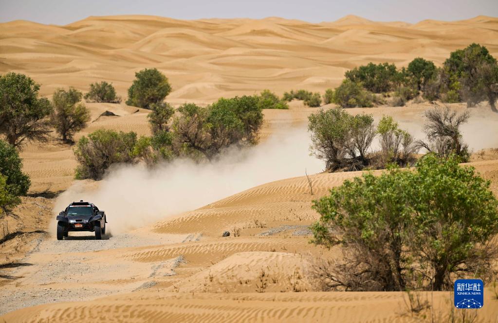 参与2023年中国环塔(国际)拉力赛的车手驾驶赛车疾驰在新疆和田地区墨玉县的沙漠中(5月28日摄)。