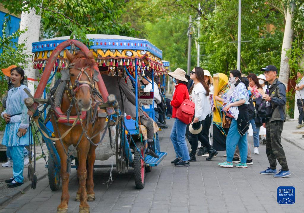 游客在新疆伊宁市喀赞其景区准备乘坐马车观光(5月18日摄)。