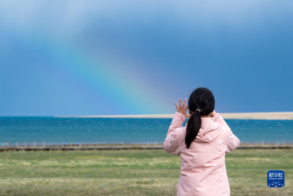 游客在新疆赛里木湖边拍摄彩虹(5月21日摄)。