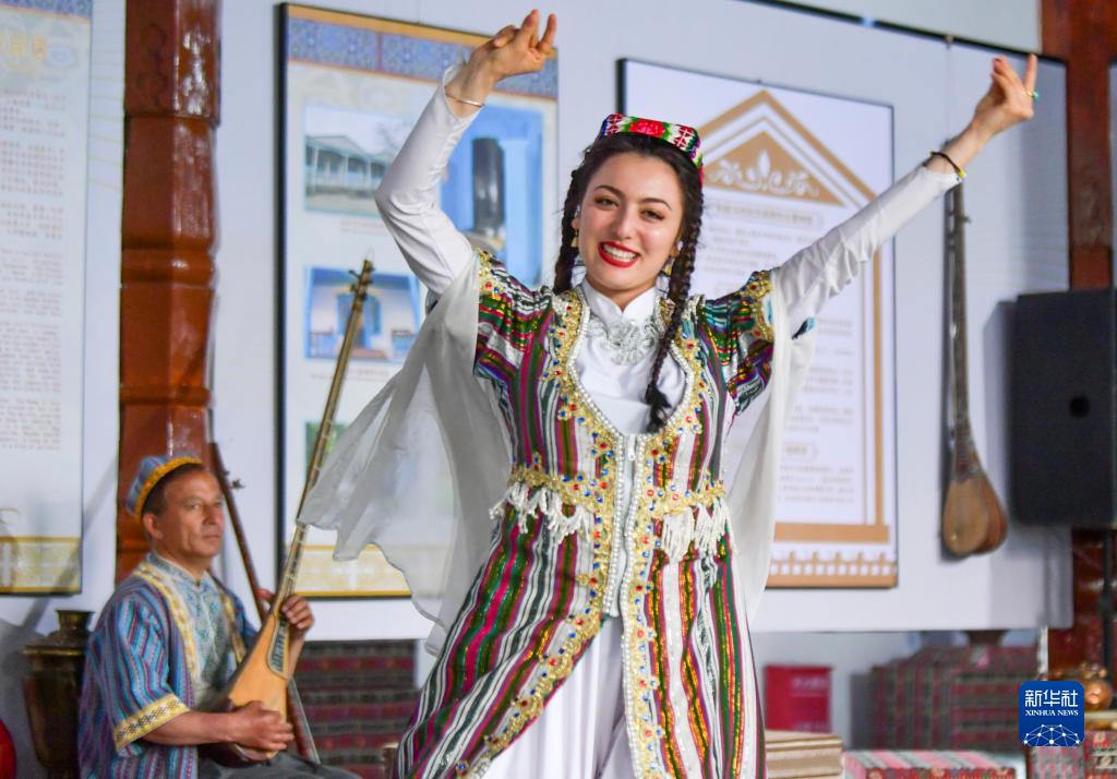 演员在新疆伊宁市喀赞其景区为游客表演“埃希来、叶来(一种乌兹别克族的民间传统乐舞)”(5月18日摄)。