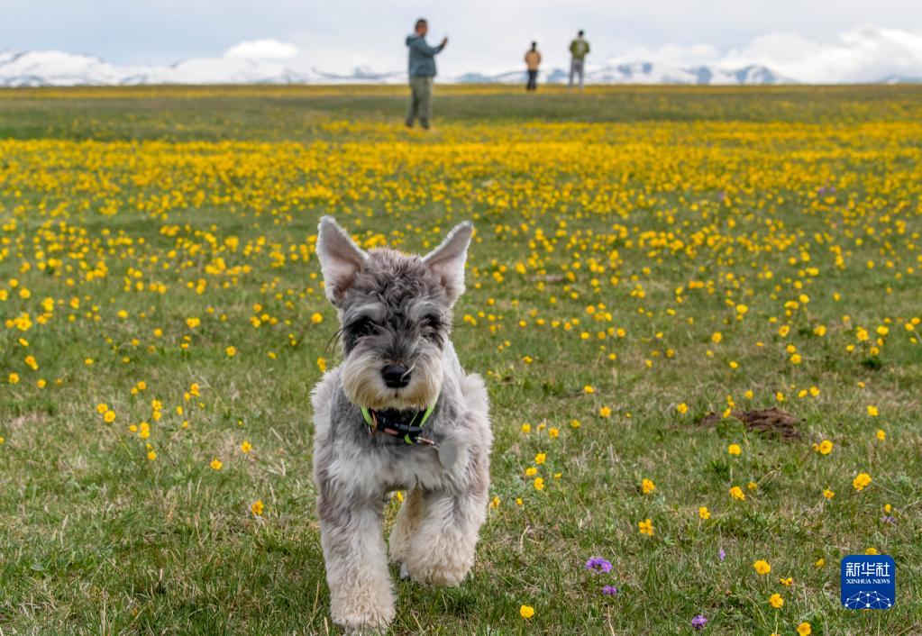 一只宠物狗在新疆赛里木湖边奔跑(5月21日摄)。